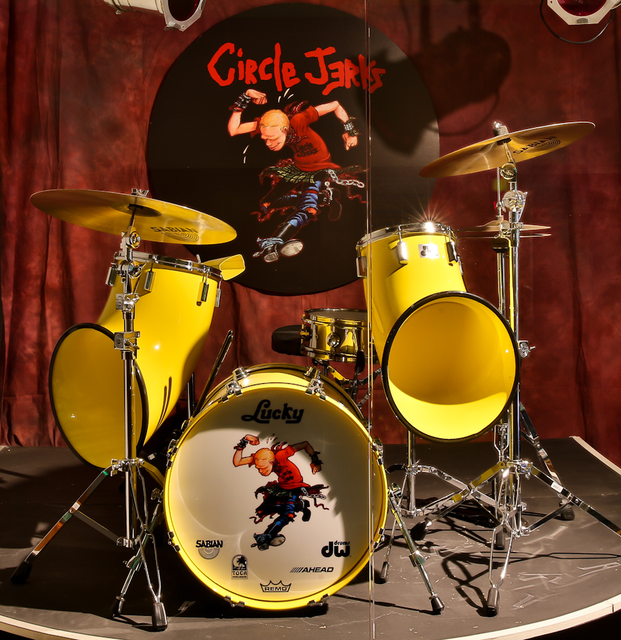 [Lucky]: Going back to the height of the L.A. punk scene, the then-popular Flipside Magazine conducted a poll. I was humbled being named everyone’s favorite punk drummer. I think Greg Ginn (Black Flag) won for best guitarist, Darby Crash (Germs) for vocals and Diane Chi (Alleycats) for bass. Honestly, I’m not a fan of polls or contests, or even drum offs. Everyone has their own style and, if they’re serious about their craft, they have something to contribute. Everyone likes to be recognized and I’ve been especially fortunate to see my drums, behind glass, at the Hard Rock Hotel and Casino in Las Vegas next to drum sets of The Doors, Jimmy Hendrix, Van Halen and Avenge Sevenfold. Recently, they put my snare drum up at the Rainbow Bar which was especially touching since I associate the Rainbow with a lot of great L.A. bands. The Rainbow was also the Lemmy’s (Motorhead’s) favorite watering hole in his later years. I was honored to have been invited to Lemmy’s funeral, his music, especially the song ACE OF SPADES, mean a lot to me.